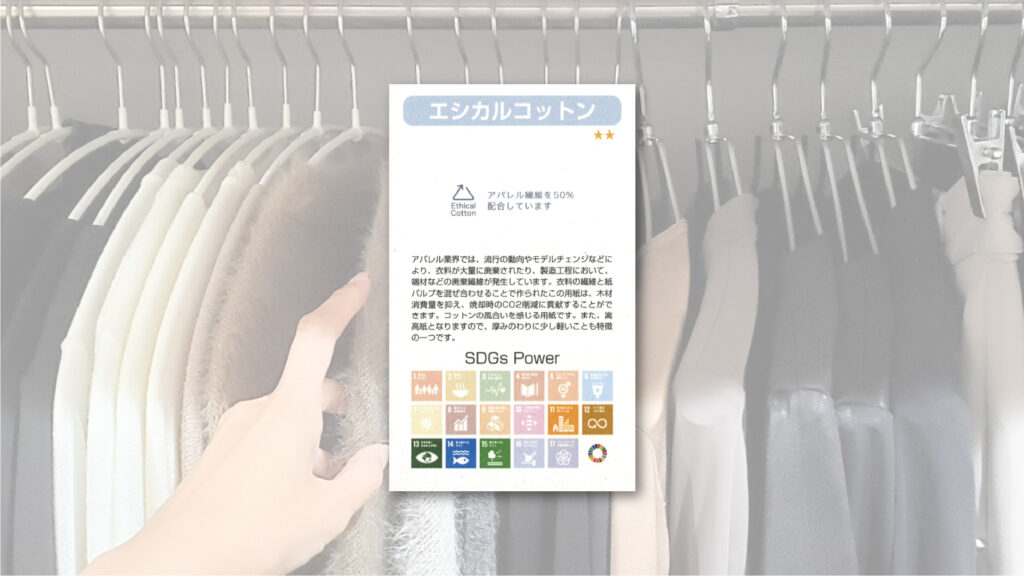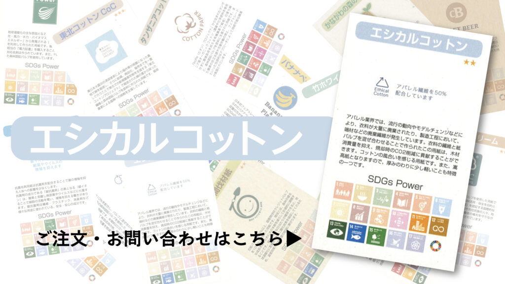 このエシカル名刺は、アパレル業界で発生する繊維の端材と紙パルプを混ぜ合わせて作られています。